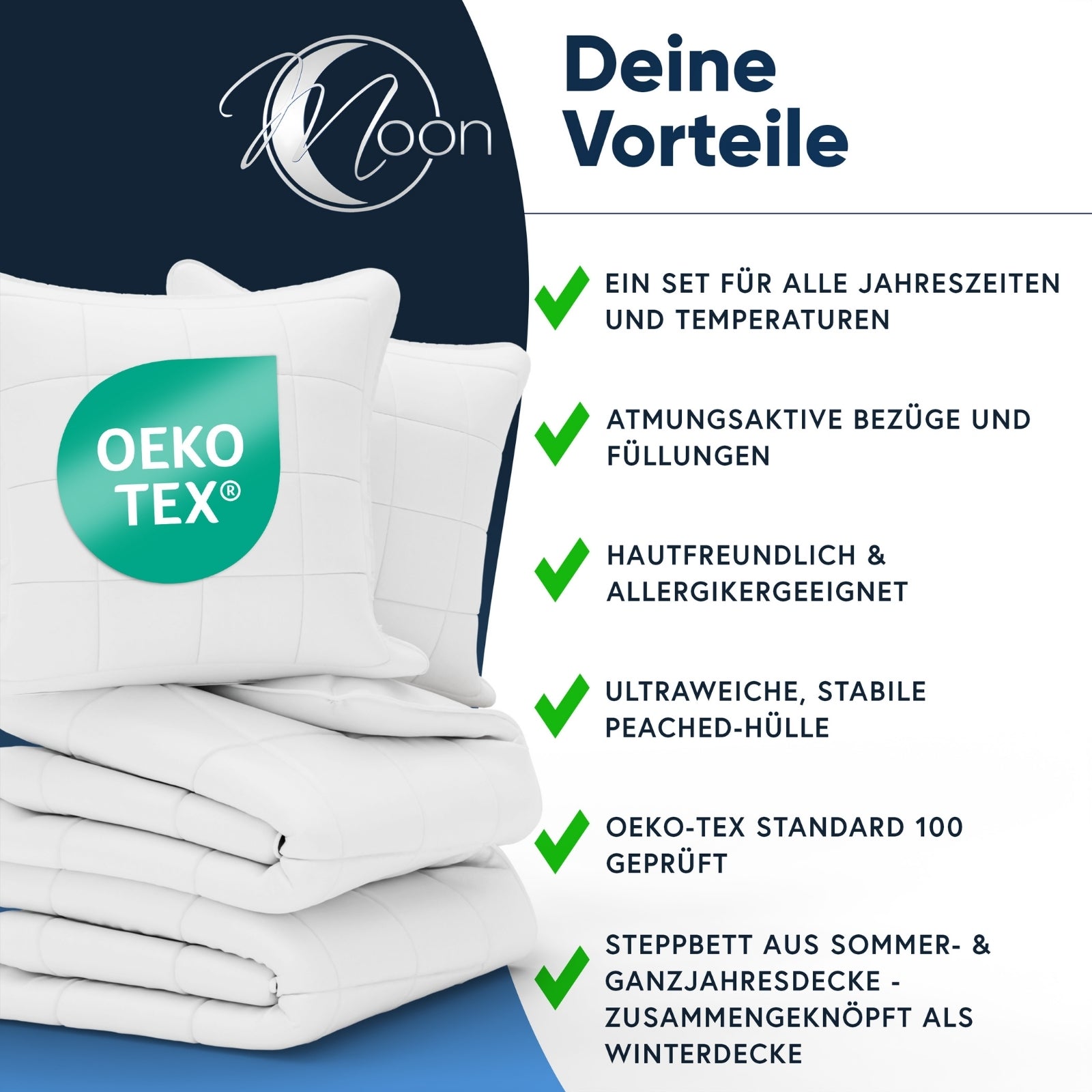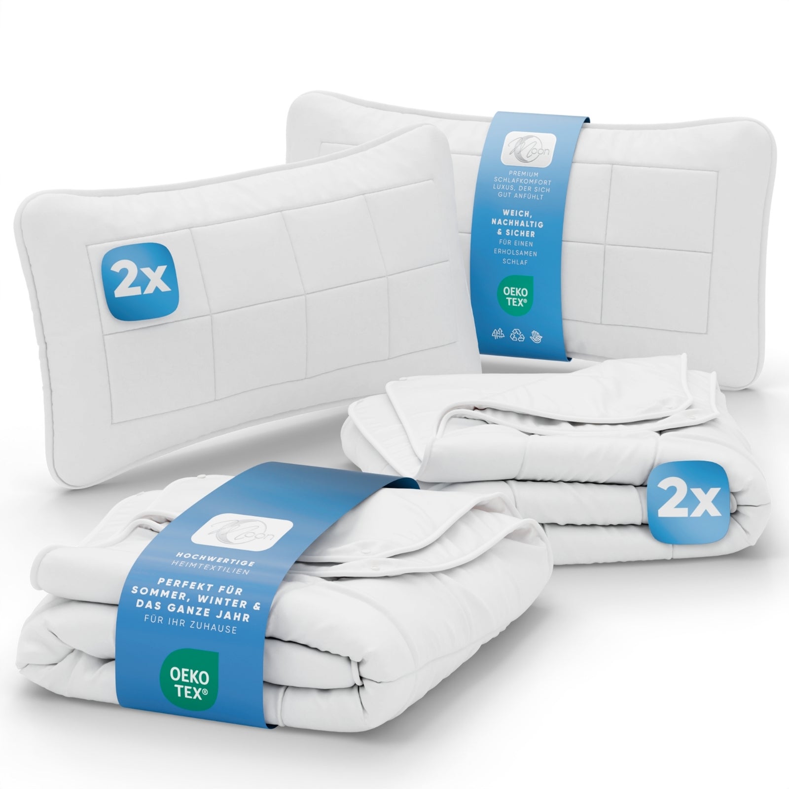 Erhältlich in verschiedenen Größen (135x200 cm oder 155x220 cm) und Kissenvarianten (40x80 cm oder 80x80 cm) – jeweils als Einzel- oder 2er-Set – bietet das MOON Classic Bettenset den perfekten Komfort für das ganze Jahr.