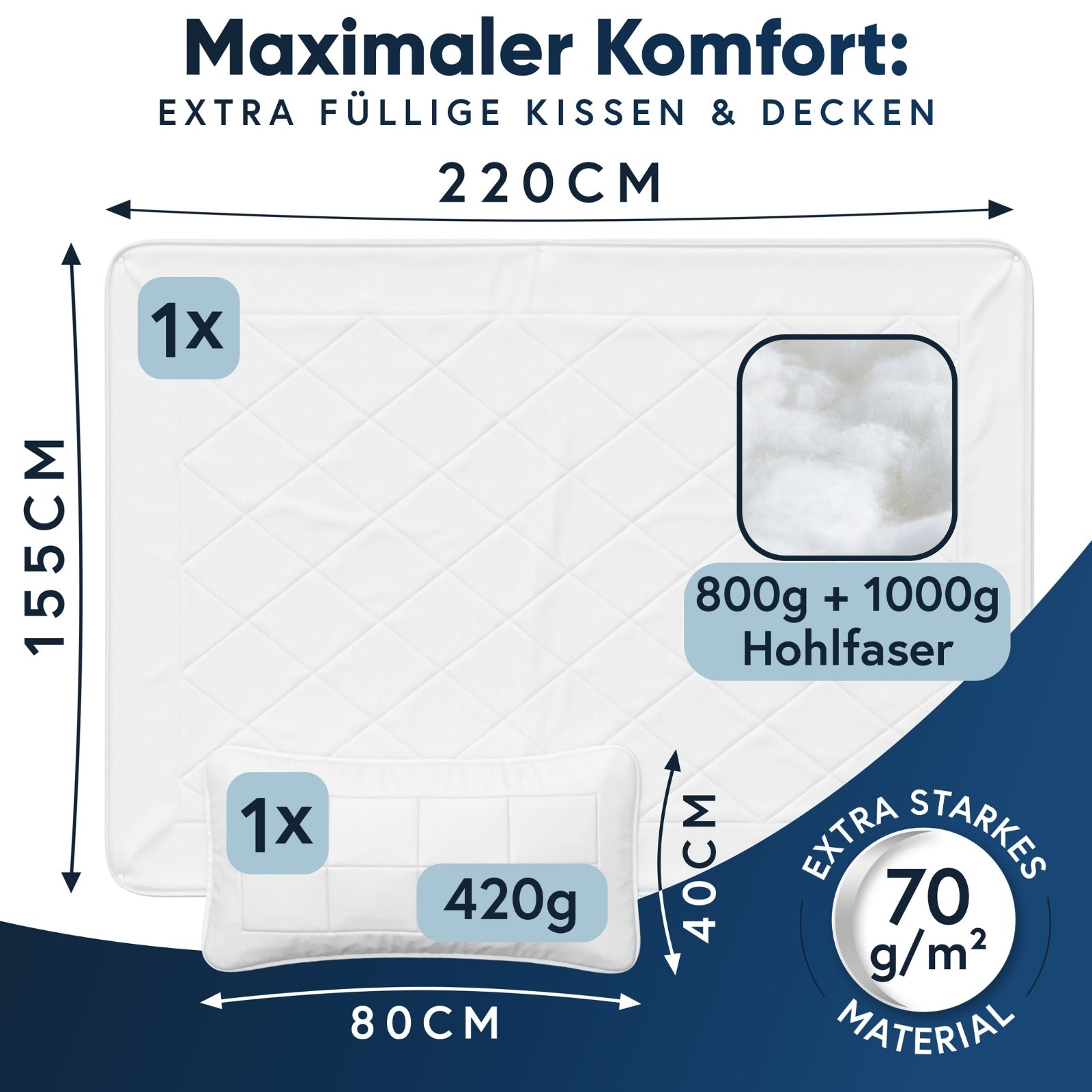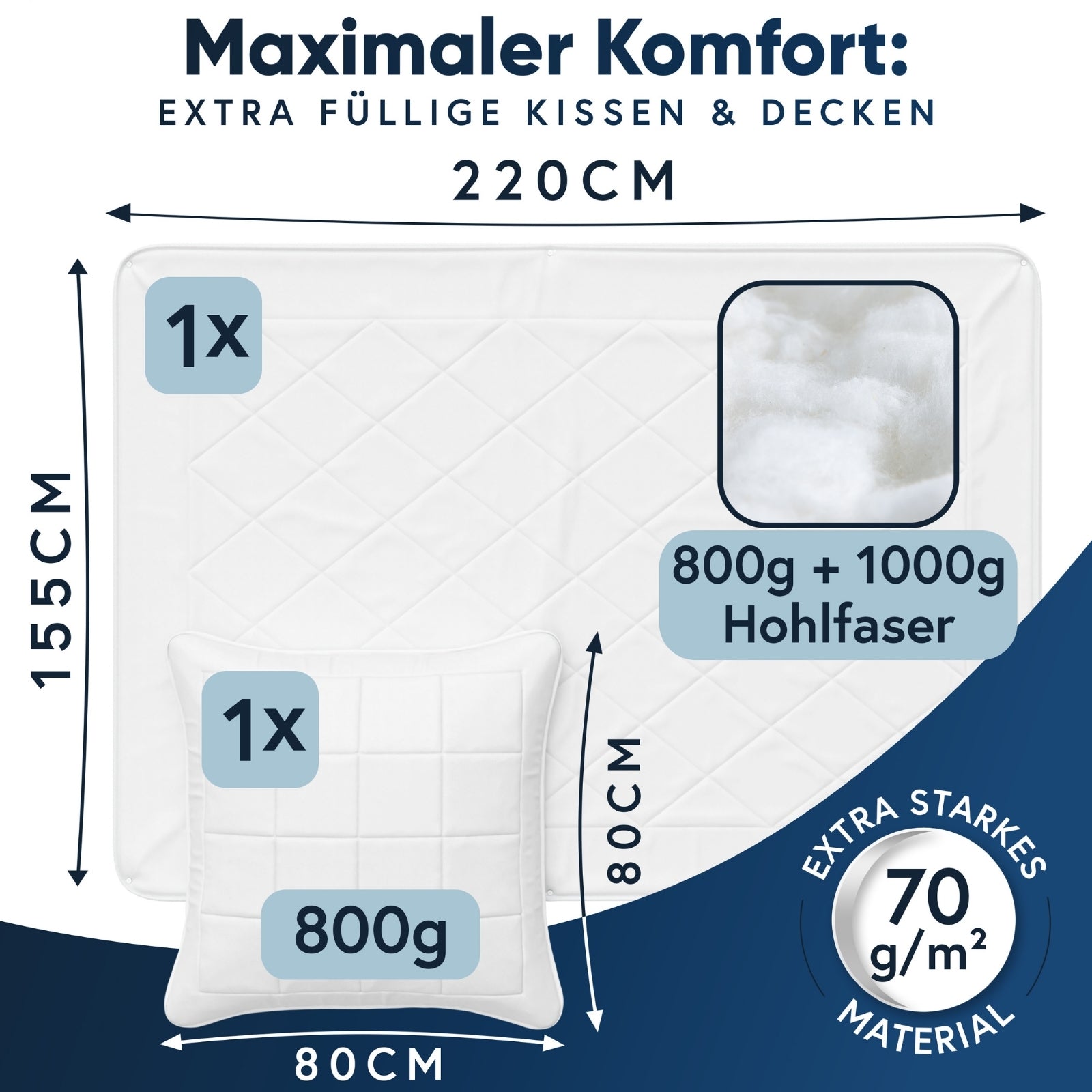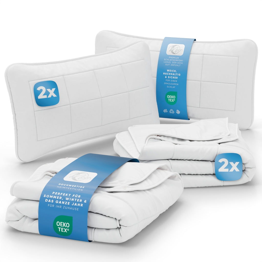 Jedes Set besteht aus einer anschmiegsamen Bettdecke und einem passenden Kopfkissen – gefüllt mit 100% Polyester-Hohlfasern, die für eine perfekte Kombination aus Leichtigkeit, Wärme und Atmungsaktivität sorgen.